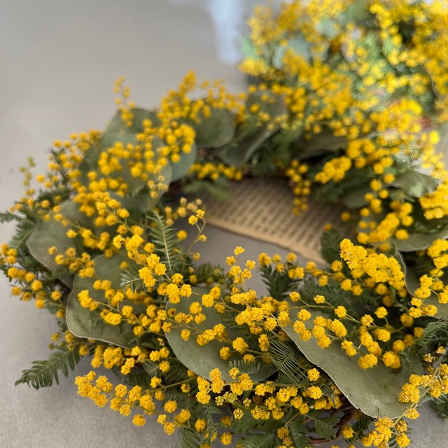 春を告げる花としても愛されている ミモザのリース 生のミモザとユーカリをリースにして、そのままドライにしました。 ======================== 受注制作となりますので、 お日にち1週間ほどいただきます。 ======================== 乾き方や段階で、多少 色やデザインが変わる場合がございます。 ご了承ください。 ドライのリースは大変繊細です。 葉や花が落ちやすい為、取り扱いには十分ご注意下さい。 リース外径 22センチ